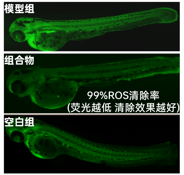 实验结果显示:该组合物具有抗氧化的功效,斑马鱼活性氧(ROS)的清除率达99%。