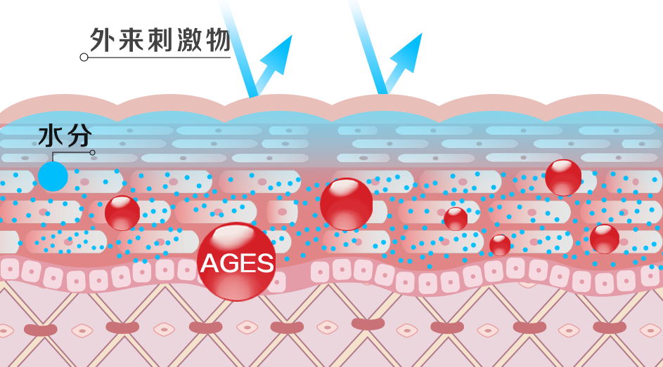 AGEs会在皮肤表皮层累积,影响皮肤的水合作用,导致皮肤屏障功能受损;还会影响皮肤微循环,导致皮肤氧气和养分供给受阻,影响细胞代谢功能,破坏皮肤健康。