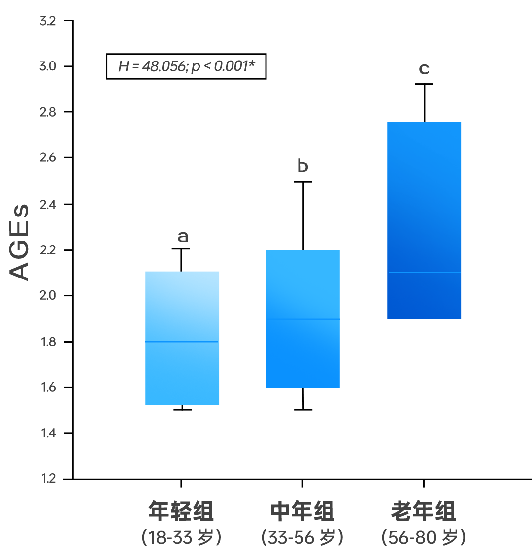 一项研究通过对237名年龄在18-80岁的健康人群进行皮肤糖化相关性分析,发现AGEs会随着年龄的增长而积累,年龄越大累积的AGEs含量越高。