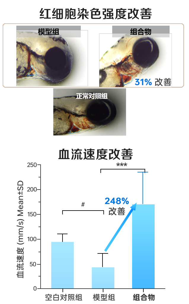 实验结果显示:该组合物具有改善微循环功效,斑马鱼红细胞染色强度得到增强,即改善了血流速度。红细胞染色强度改善效果为31%,血流速度改善效果为248%。