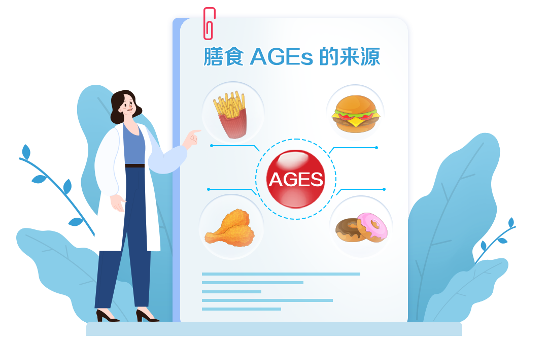 AGEs是由糖与蛋白质通过一系列复杂的糖化反应,产生的黄褐色、稳定、不可逆的化合物。