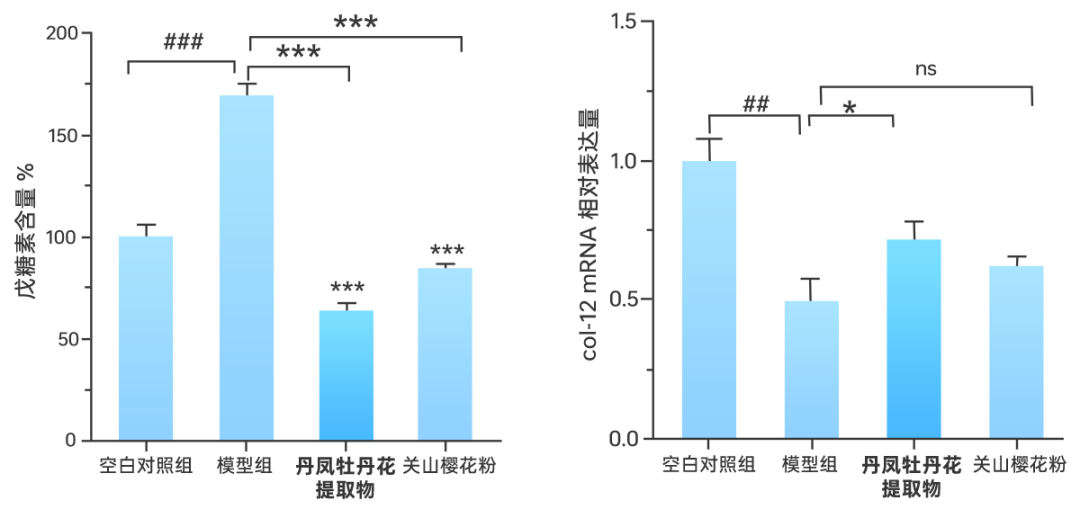 此外,丹凤牡丹花液还可以促进线虫与人源相近的胶原蛋白col-12 mRNA表达量,关山樱花粉则无显著性差异。