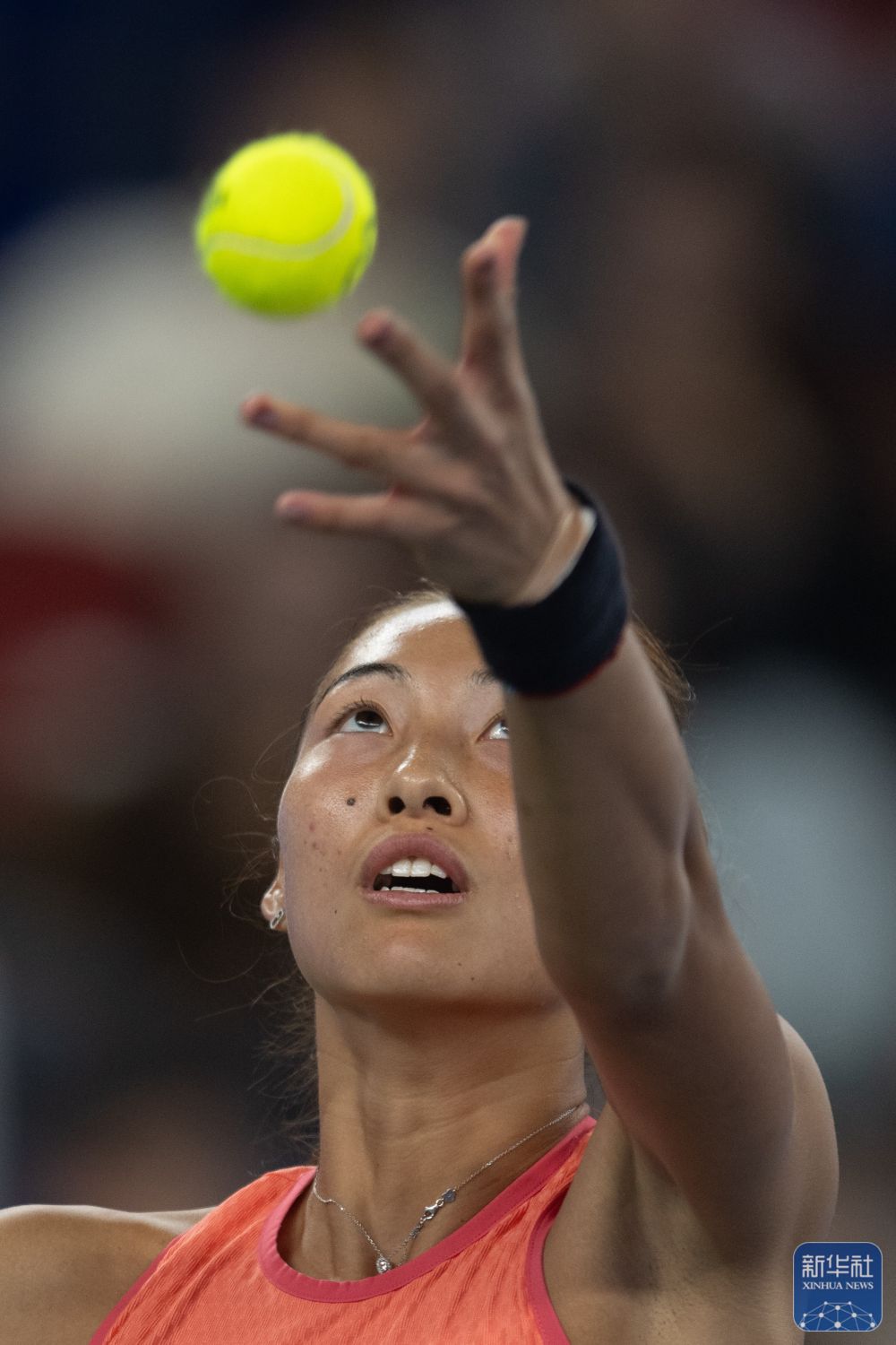 ↑郑钦文在比赛中发球。新华社记者 肖艺九 摄