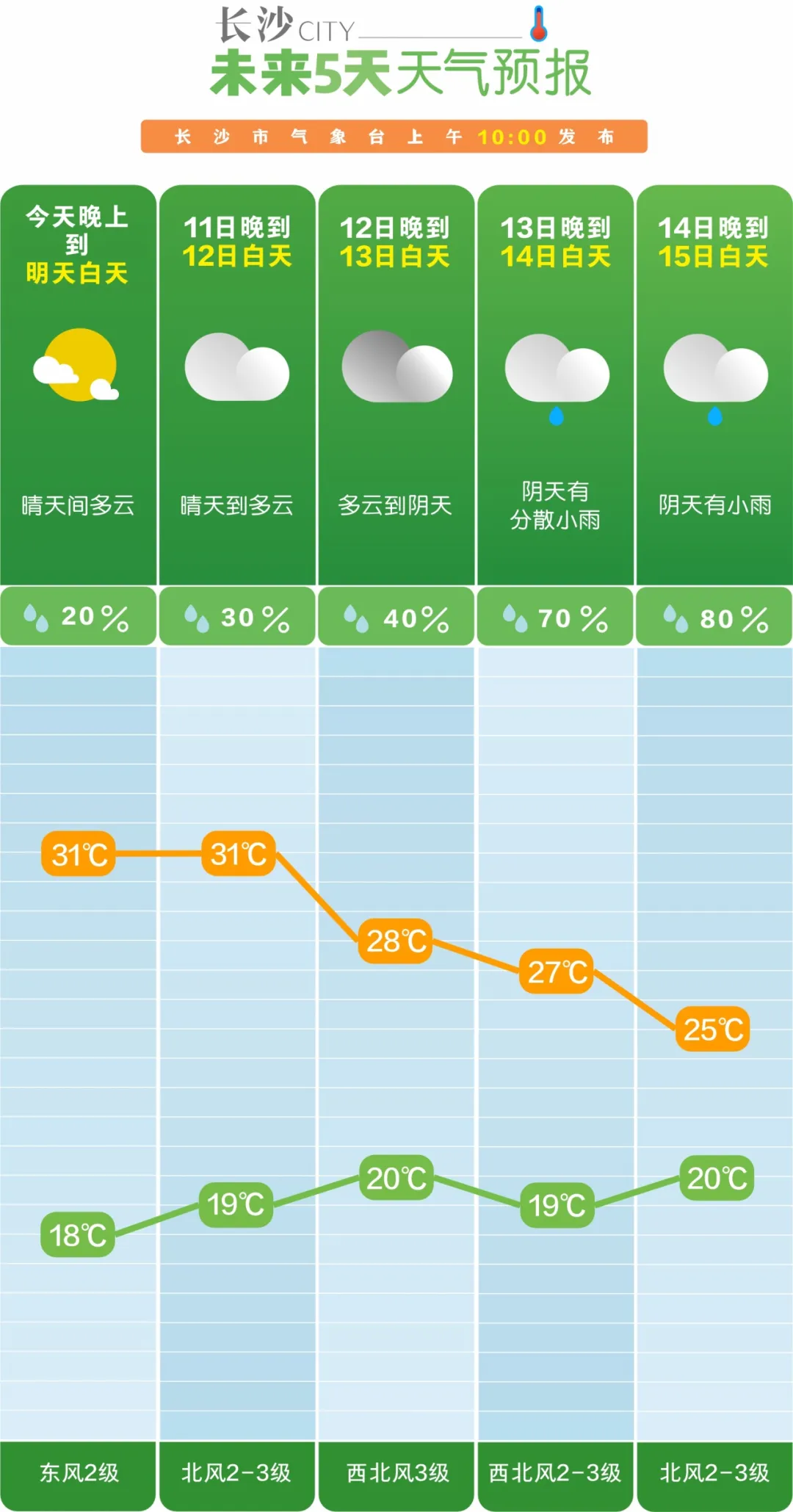 10月12日晚上到13日白天,湘北阴天有小到中雨,湘西州北部、张家界西部局地大雨,其他地区多云间晴天;北风2~3级;最高气温湘南、湘东28~30℃,其他地区20~22℃;最低气温湘西北15~17℃,其他地区18~20℃。