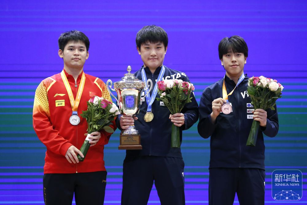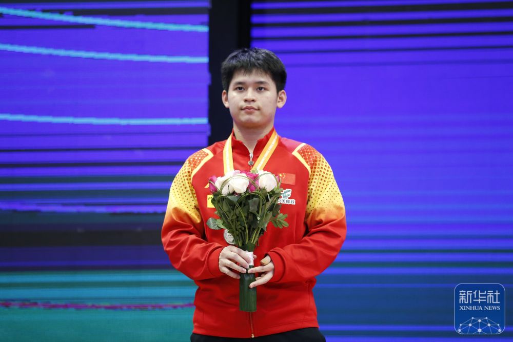 ↑亚军中国选手林诗栋在颁奖仪式上。