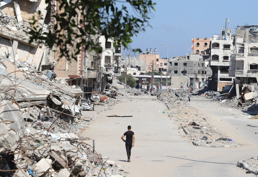 10月9日,在加沙地带北部杰巴利耶,一名男子从建筑废墟旁走过。新华社发(阿卜杜勒拉赫曼·萨拉马摄)