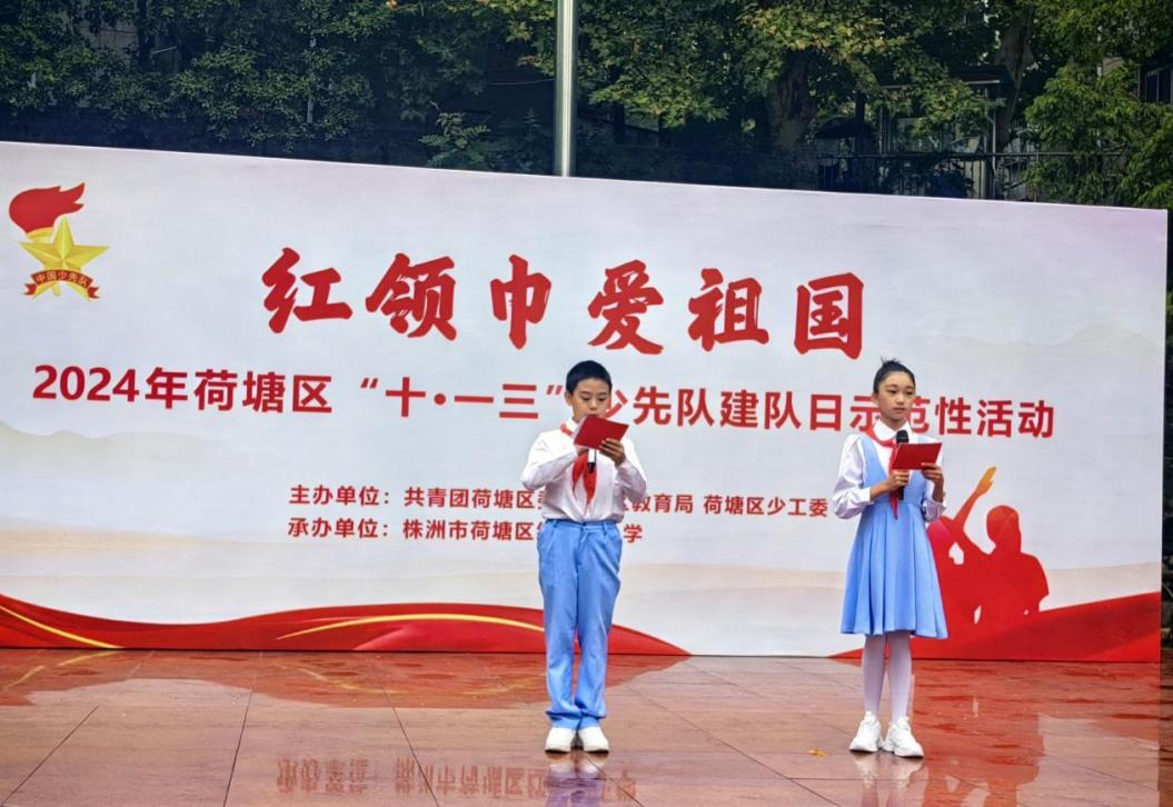 10月14日上午,为全面贯彻落实党的二十大和二十届三中全会精神,深入学习贯彻习近平总书记关于少年儿童和少先队工作的重要论述,激发少先队员的组织感、光荣感和使命感,开启“入队、入团、入党”的人生奋进三部曲,团株洲市荷塘区委联合区教育局在该区红旗路小学开展“红领巾爱祖国”少先队主题队日暨“我是接班人·行走的思政课”活动。荷塘区人民政府副区长罗曼出席活动。