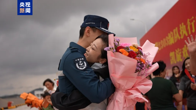 上午10时许,海警梅山舰、秀山舰依次停靠码头,中国海警局直属第二局在码头举行隆重的欢迎仪式,迎接编队凯旋。