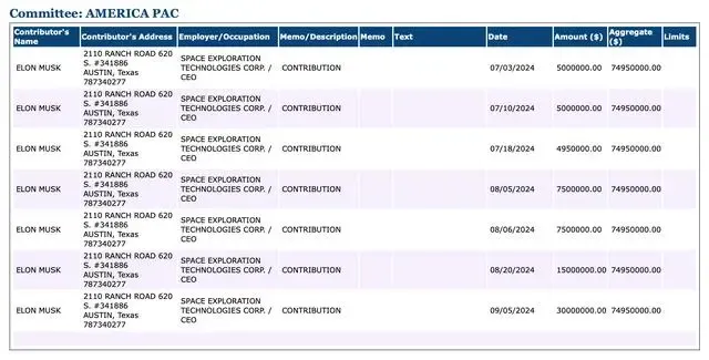 马斯克对该政治委员会的巨额财政支持使他立刻跻身共和党巨额捐款金主之列,与金沙集团创办人阿德尔森的遗孀米里亚姆·阿德尔森(MiriamAdelson)等人物并列。阿德尔森在同一时期向另一个支持特朗普的超级政治行动委员会——保护美国政治行动委员会(PAC)捐赠了9500万美元。