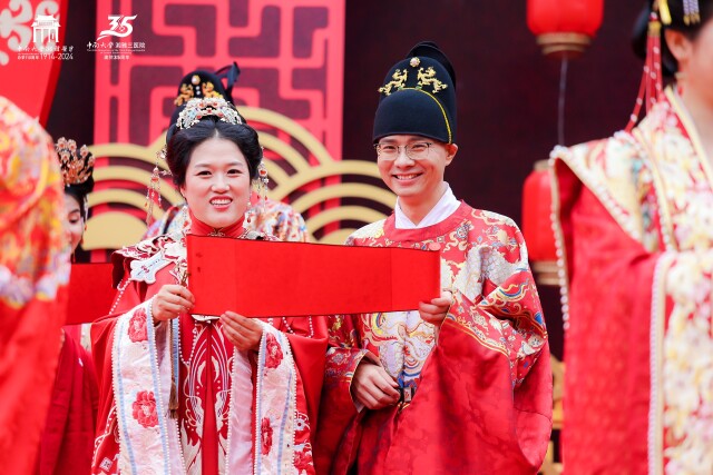 该院党委书记何庆南为新人主婚。“中式婚礼承载着千年的传统文化。它不仅仅是一种仪式,更是一种对家族传承、夫妻责任、社会和谐的庄重承诺。在这个科技、信息高度发达的时代,我们依然回归传统,举办这样一场中式集体婚礼,是希望新人们能够从传统文化中汲取力量。夫妻之间的忠诚、家庭中的孝道,这些美德如同璀璨的明珠,历经岁月而不衰。”