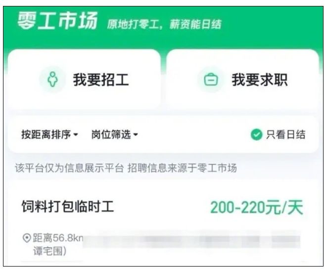 此外,该小程序还有“只看日结”选项,目前显示只有广东江门地区日结“饲料打包临时工”一岗位,日薪200元—220元。