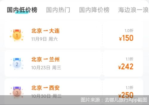 近一段时间以来,部分国内航线机票价格逐渐走低。去哪儿旅行App显示,北京—大连最低票价150元,折扣为1折;北京—兰州最低票价为242元,低至1.1折。机票价格的走低,也让消费者出游热情变得更加高涨。