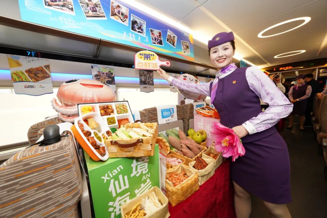 在4号车厢,山东济铁旅行服务有限公司推出了高铁特色海珍品套餐、蒲烧鳗鱼饭、海肠捞饭、胶东大鲅鱼水饺等美食,供旅客品尝选购。“没想到在高铁上还能吃到这样的美食。我刚刚品尝了潍县萝卜和莱阳梨,还买了一些鳕鱼片准备带回去给孩子吃。”旅客王女士说。