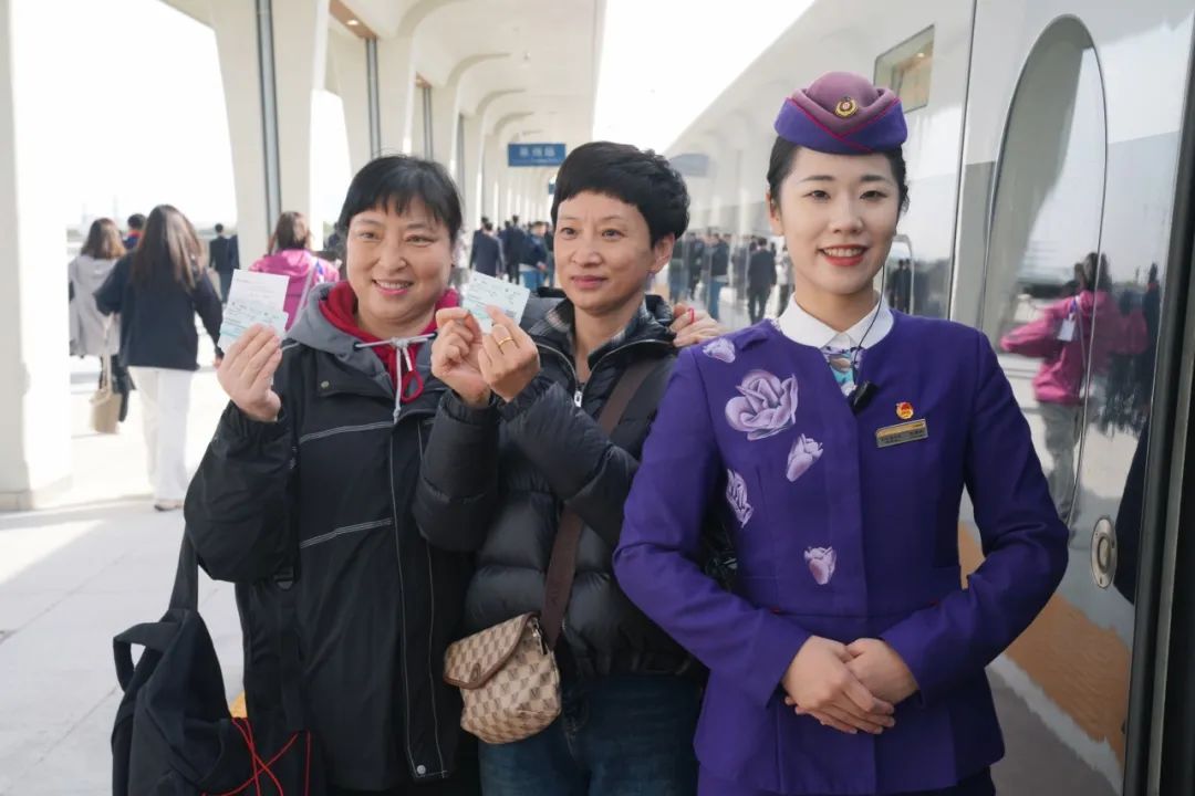 列车启动后,精彩纷呈的演出活动轮番上演。乘务人员身着寓意“紫气东来”的乘务组制服惊艳亮相。