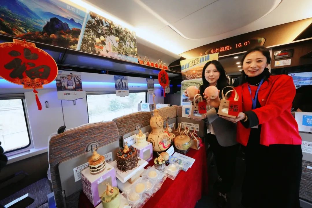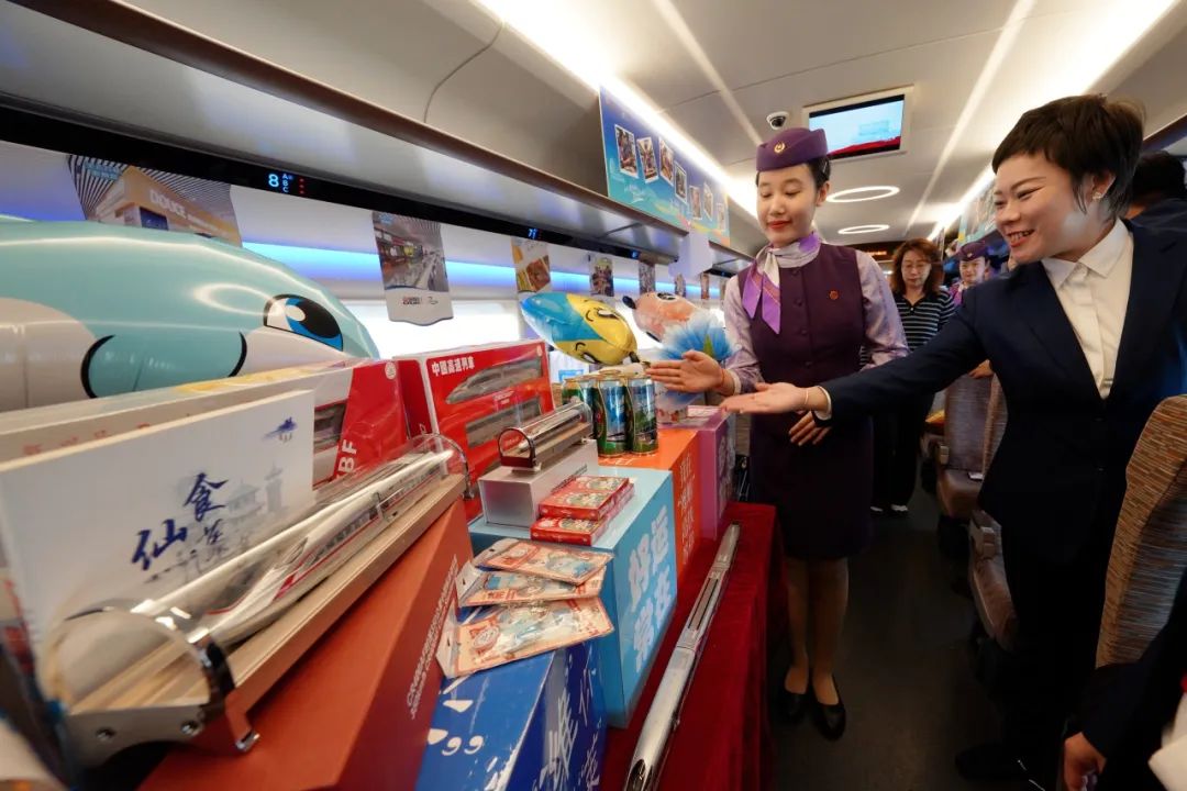 9时45分,以“潍烟高铁直通仙境”为主题的沿线旅游推介活动“热闹”开场,各种文创、特产和研学产品亮相车厢,让人应接不暇。
