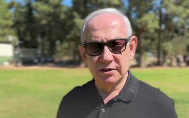 媒体发布的视频显示,内塔尼亚胡身着黑色Polo衫、戴着太阳镜,在阳光明媚的公园内,边走边对着镜头说道:
