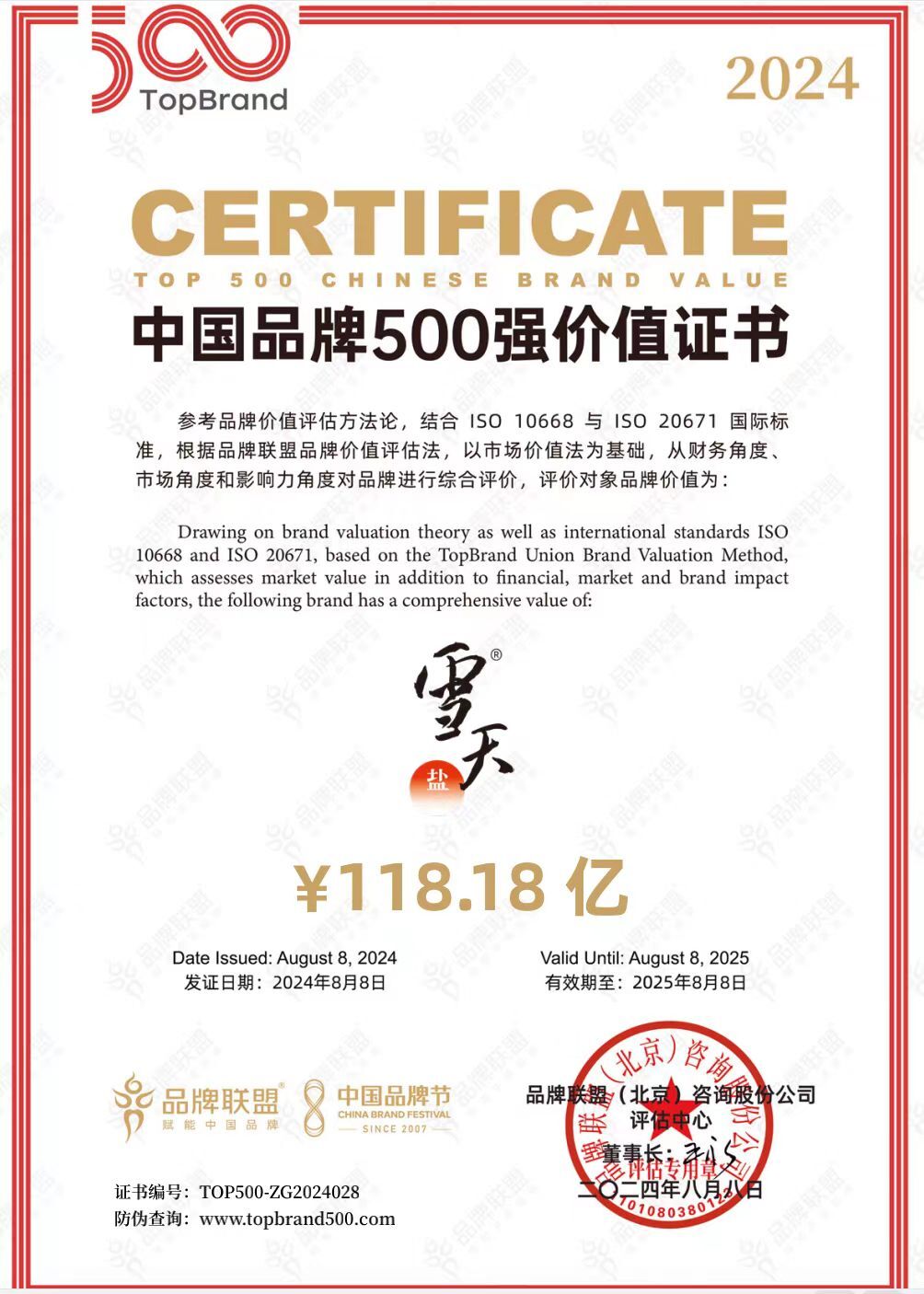 持续聚焦品类推广与爆品打造,雪天盐业连续两年入选央视“民族品牌”,荣获2023年中国顾客满意度指数盐行业满意度第1名。2024年8月,“雪天”蝉联“中国品牌500强”,品牌估值118.18亿元,较上年提升23个位次,“雪天”品牌影响力持续增强。