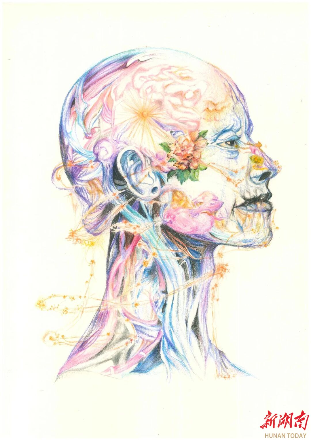 23级应用心理学2班柯舒雯的画作名为《生命的真谛》。画作中,她用明艳的色彩画出了人的头部结构,在太阳穴处描绘了一朵盛开的花,以其为视觉中心,重点对眼眸与鼻窦相连的神经进行着色。