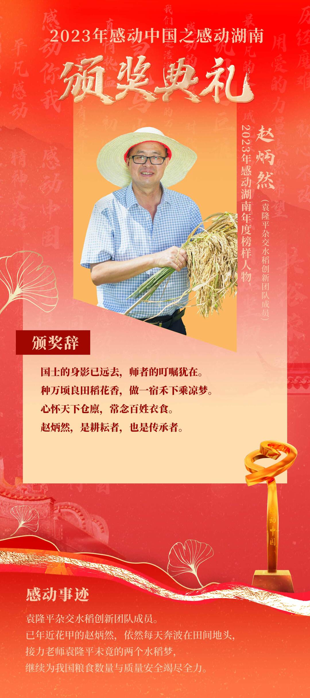 赵炳然,国家杂交水稻工程技术研究中心研究员,2023“感动湖南”年度榜样人物。37年来,一直从事水稻研究工作,带领团队研发出特定绿色优质水稻“臻两优8612”“韶香100”等优质水稻品种。