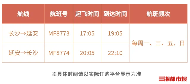 10月27日起,厦航正式开通长沙往返延安的直飞航线,此举不仅丰富了厦航的航线网络,更为广大旅客提供了前往延安革命圣地的快速通道。目前,该航线的机票已全面开放预订,旅客可通过厦门航空官网或各大平台进行购买。厦航新开长沙至延安航线,航班号为MF8773/4,每周一、三、五、七执飞,长沙起飞时间17:05,抵达延安时间19:05;延安起飞时间20:05,抵达长沙时间22:10。