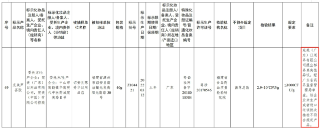 10月22日,国家药监局官网发布《关于49批次不符合规定化妆品的通告(2024年第40号)》。通告显示,在2024年国家化妆品抽样检验工作中,经福建省食品药品质量检验研究院等单位检验,发现49批次化妆品不符合规定。这49批次不符合规定化妆品中,24批次为防晒产品,12批次为染发产品,其它批次为洗发水、护发素等产品。其中,显示为完美(广东)日用品有限公司(简称“完美公司”)生产的1个批次的完美芦荟胶菌落总数超标。