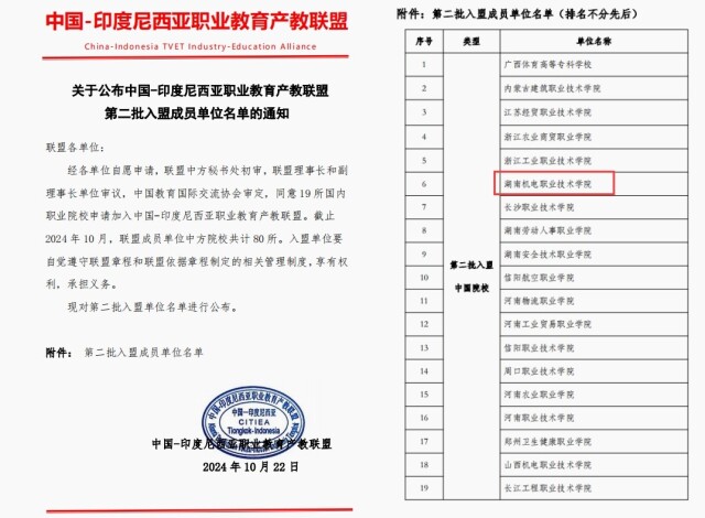 湖南日报10月29日讯(通讯员 代振维)近日,湖南机电职业技术学院凭借其在职业教育领域的卓越成就和坚实基础,经过严格的筛选和审议程序,与全国其他18所杰出职业院校一起,成为中国—印度尼西亚职业教育产教联盟的新成员。至此,该联盟中的中方院校阵容扩大至80所,不仅标志着中国与印度尼西亚在职业教育领域的合作迈向了新高度,也预示着双方将携手开启合作新篇章。