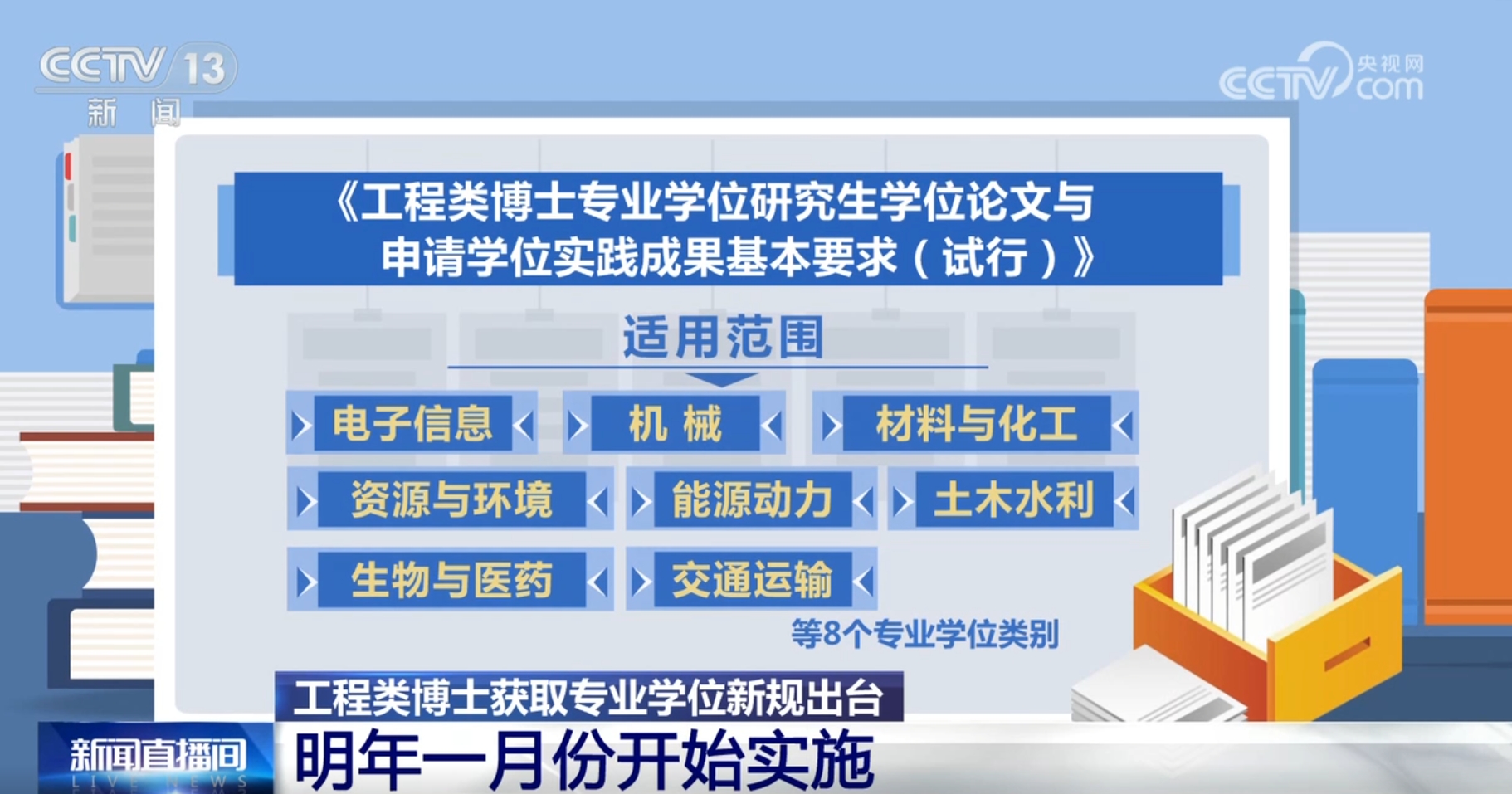 央视网消息:今年审议通过的《中华人民共和国学位法》规定,博士研究生可以“通过学位论文答辩或者规定的实践成果答辩申请学位。”其中,“实践成果答辩”是一条新渠道。具体如何实施?近日,国务院学位委员会办公室转发《工程类博士专业学位研究生学位论文与申请学位实践成果基本要求(试行)》(以下简称《基本要求》),并将于明年一月份开始实施。
