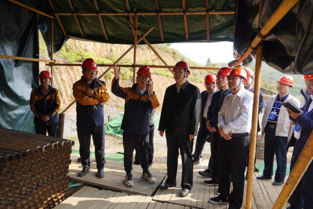 在水埠头锰矿矿区勘探现场,许大纯一行仔细实地考察了项目施工、成矿条件以及资源总量等情况,省物化所总工程师徐军伟详细介绍了永州市锰矿资源情况、施工项目情况、锰矿勘察进展及绿色勘查工作开展。