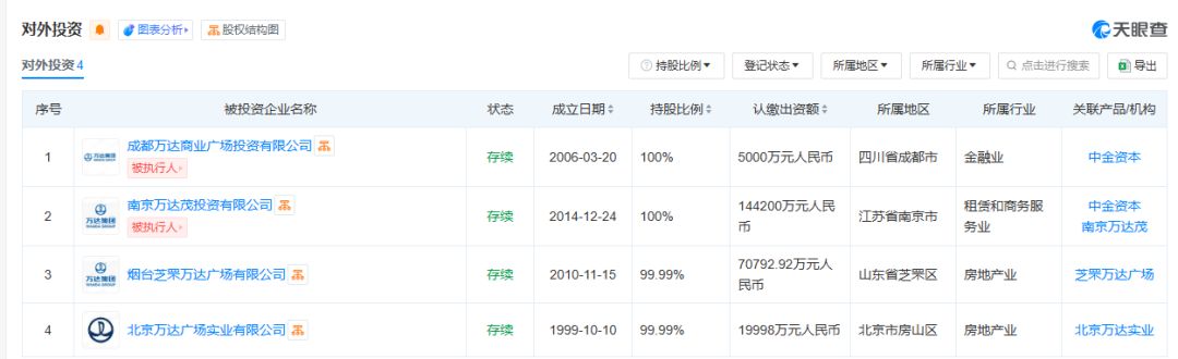 截至11月1日,天眼查显示,坤华(天津)股权投资合伙企业(有限合伙)已接盘万达旗下烟台芝罘万达广场有限公司、北京万达广场实业有限公司、南京万达茂投资有限公司、成都万达商业广场投资有限公司。