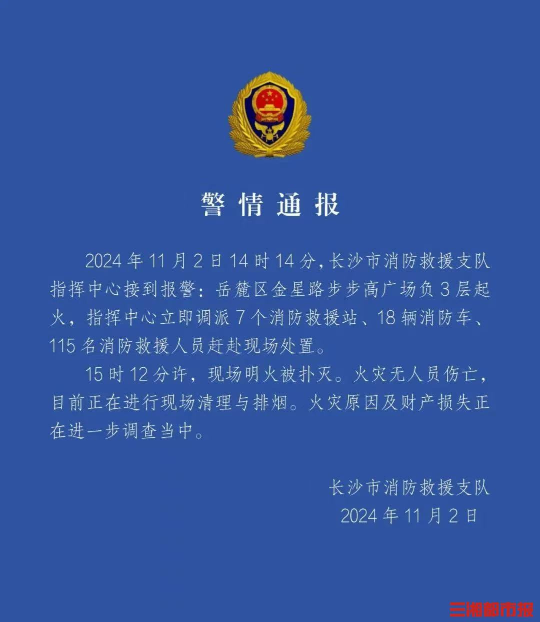 11月2日,长沙市岳麓区金星路步步高广场发生火灾。根据长沙市消防发布的警情通报称,明火已被扑灭,无人员伤亡,目前事故原因正在进一步调查中。(文/视频 全媒体记者 田甜 通讯员 葛纪彤)