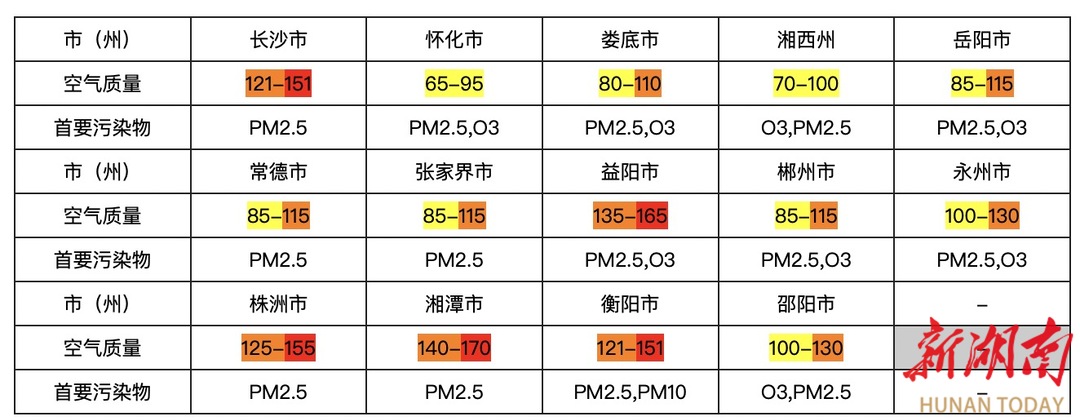 根据省生态环境监测中心预报,未来24小时,全省大气扩散条件一般,湘潭有中度污染,益阳、长沙、株洲、衡阳、邵阳、永州有轻度污染,其余7个市州空气质量良好。