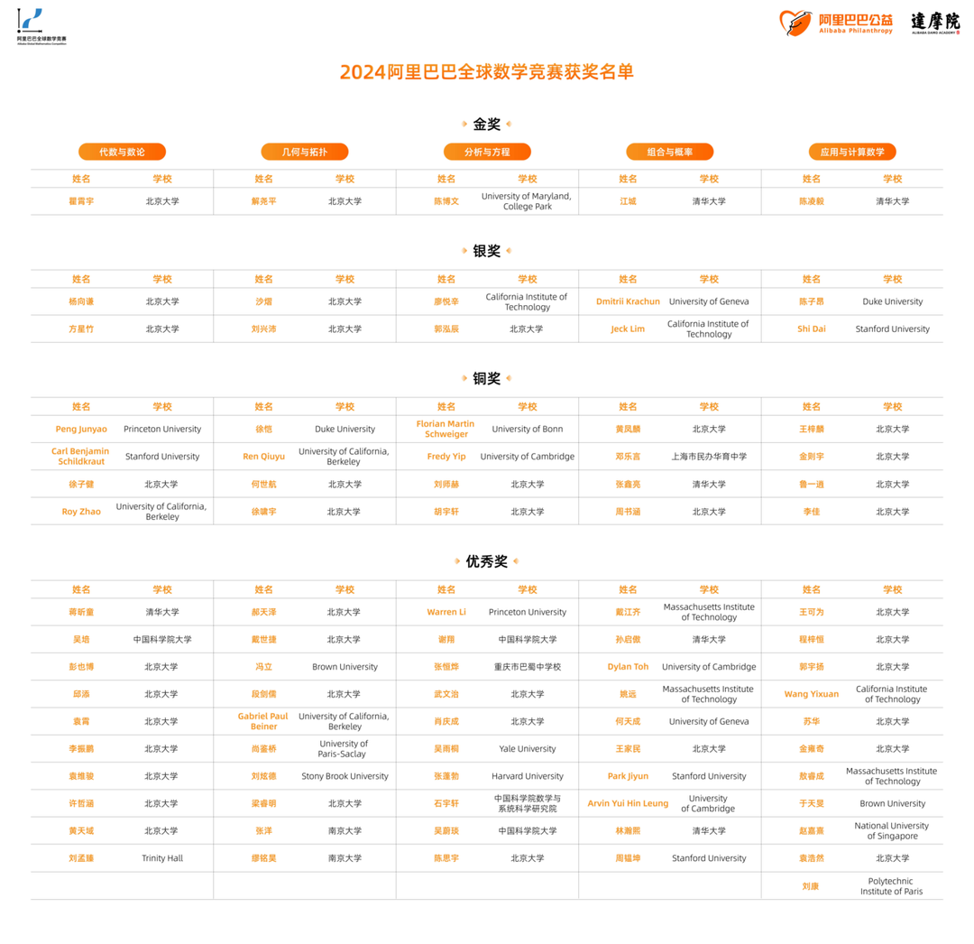 阿里巴巴全球数学竞赛获奖名单已正式发布,共有86名选手获奖,其中金奖5名,银奖10名,铜奖20名,优秀奖51名。我们对各位获奖选手表示祝贺,并衷心感谢大家对本届竞赛的关注和支持。