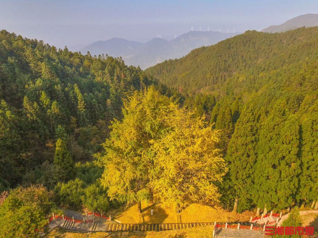 三湘都市报·新湖南客户端11月3日讯(全媒体记者 曾冠霖)在湖南省天岳幕阜山海拔1200米的隐秘山谷中,藏有一处名为天乐堂的秘境,它不仅蕴藏着古老天文学的无尽奥秘,更因三棵屹立近千年的古银杏树而声名远播,被当地人亲昵地唤作“银杏三姊妹”。11月2日,当记者来到这里,眼前的三棵古树早已换上了金黄的盛装,正以最绚烂的姿态迎接每一位游客。
