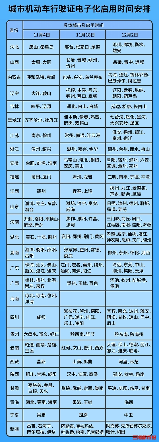根据安排时间表,湖南的湘潭、衡阳、邵阳、岳阳于11月4日启用,张家界、益阳、常德、娄底11月18日启用,郴州、永州、怀化、湘西在12月2日启用。