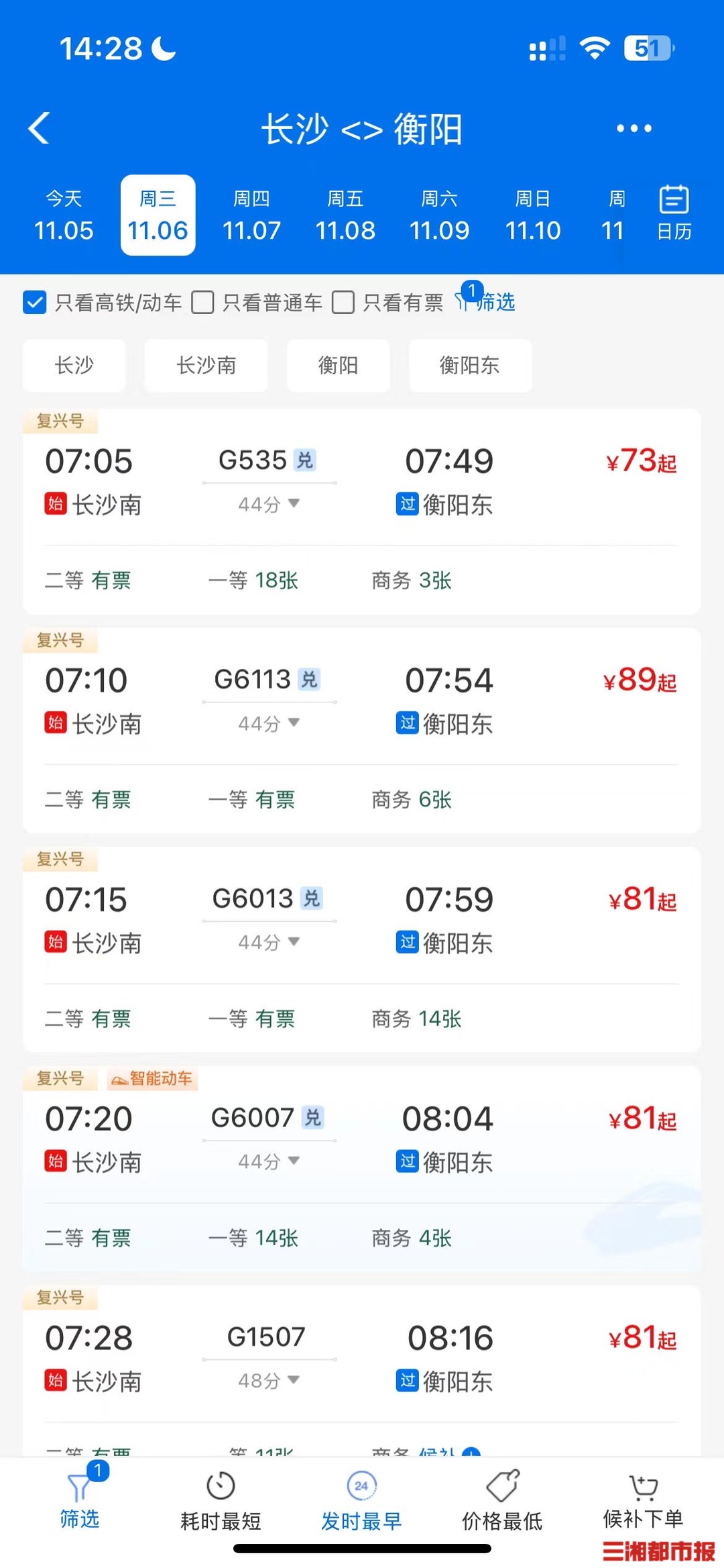 记者通过12306APP查询发现,11月6日,7时至8时,长沙南开往衡阳东的高铁列车共有9趟,平均不到7分钟就有一趟列车从长沙南发出。