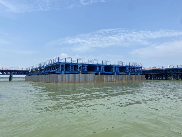 目前,新型围堰已经应用到项目的桩基施工中,成功将施工水域和武昌鱼的家园隔离开来。“别看护筒里面是泥浆,围堰外部的水却是清澈干净的,有时还能看到小鱼呢。”项目党支部书记陈竹表示。检测数据显示,周边水域PH值、溶氧量、悬浮物等6项指标都符合《地表水环境质量标准》。