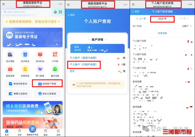 如需查询个人账户收支情况,在“湘医保服务平台”首页点击“医保账户查询”,点击“个人账户(记账户余额)”,进入“个人账户收支明细”页面,选择年度,往下滑动屏幕可以看到年度内所有的个人账户划账收入、使用支出记录,包括时间、数额、地点等详细信息。
