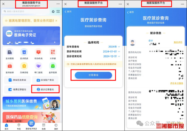 如需查询医保报销情况,在“湘医保服务平台”首页点击“就诊记录查询”,选择年度,点击“立即查询”,往下滑动屏幕可以看到年度内所有的医保就诊使用记录,包括医药机构名称、时间、费用支出及组成等详细信息。
