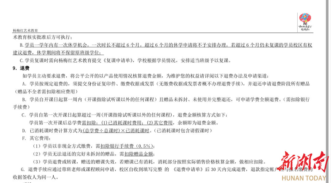 刘女士与杨梅红艺术教育签订的合同中明确:校区自收到填写完整的《退费申请单》后30天内完成退款 受访者供图