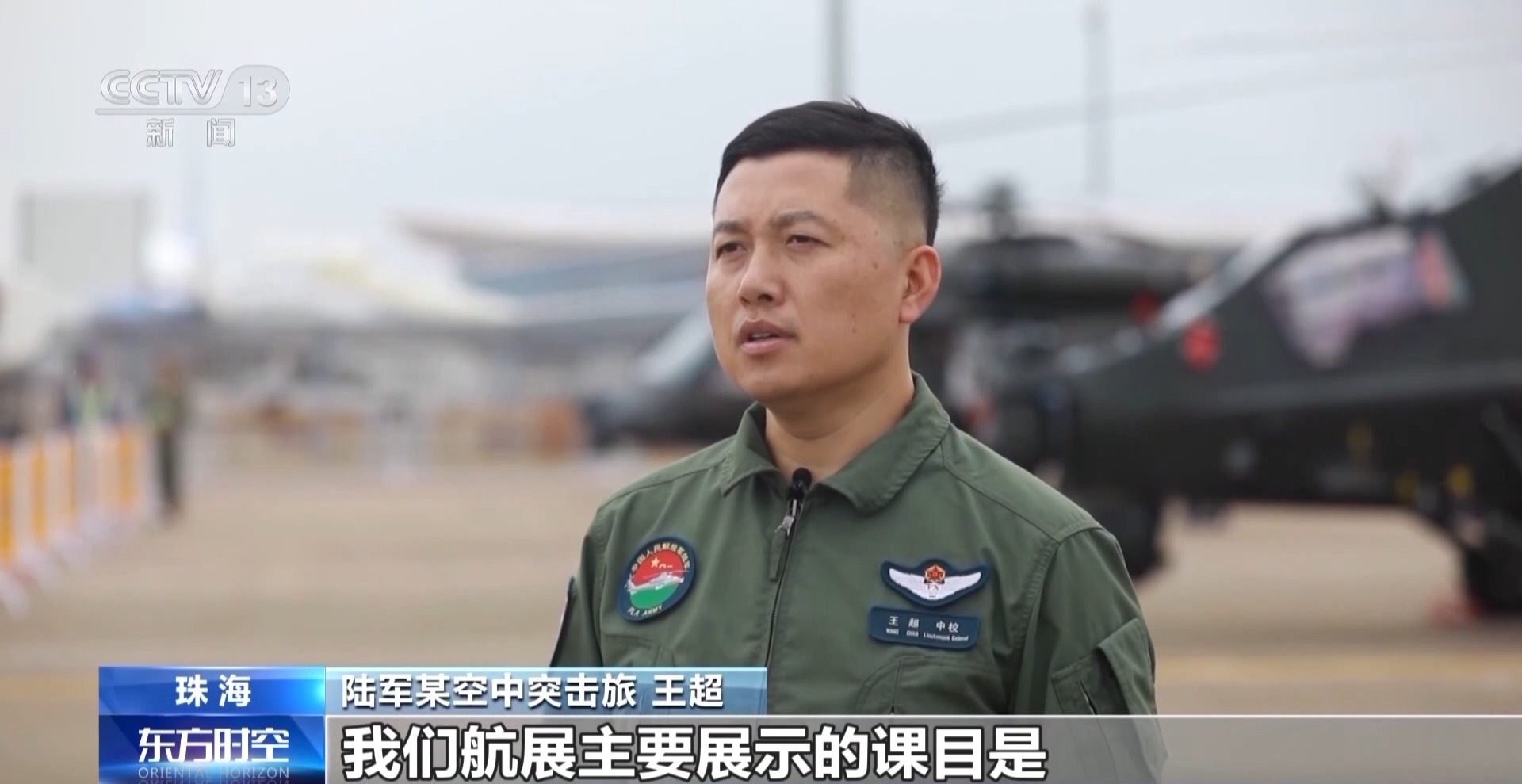 陆军某空中突击旅 王超:这一次,我们航展主要展示的课目是编队飞行、外吊挂飞行,以及直-10和直-20单机动作的表演。主要是验证、展示装备性能特点。也是基于我们平时的训练大纲,展示我们陆航空突部队训练质效、装备性能和作风养成。平时我们是怎么练的,这一次我们就怎么演。