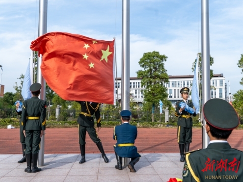 入场完毕后,全体师生肃立,五星红旗和校旗伴随着国歌和校歌在蓝天的映衬下冉冉升起。