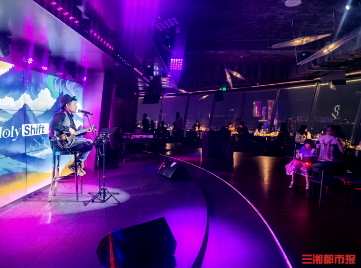11月初的一日晚上,7时许,长沙春天29层,切幻·空中旋转餐厅门口,一二十位顾客正排队等位。餐厅内,一对用餐的小姐妹在浅笑;身后一位男士独坐,看着手机端起一杯水又放下,对面不远处的一对情侣正望着窗外发呆;围坐在窗前的一大家子正分享着食物,一个小女孩坐在一旁的凳子上,认真听驻场歌手抱着吉他弹唱,整个餐厅随《这个杀手不太冷》的主题曲《Shape Of My Heart》慢悠悠地转着。