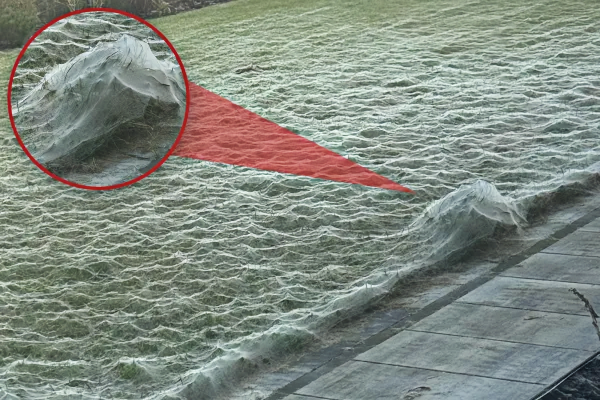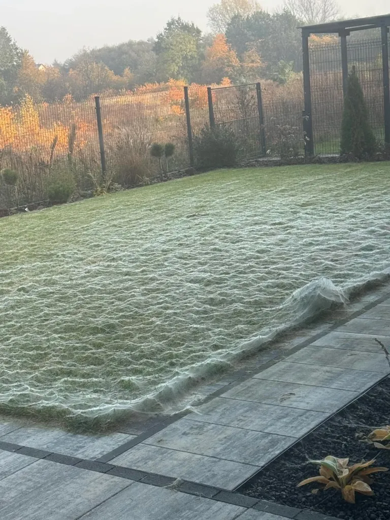 然而,当他推开前门时,眼前的景象让他瞬间呆住了——整个草坪被一层巨大的蜘蛛网笼罩,宛如恐怖电影中的场景。这一瞬间,28 岁的马切伊几乎要惊叫出来。虽然他心里明白这是自然现象,但“整片草坪被蛛网覆盖”的视觉冲击,足以让任何人心跳加速。
