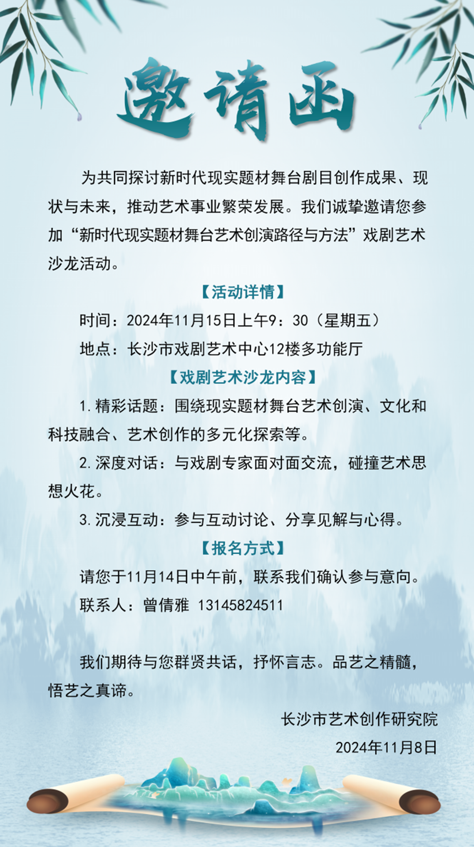 湖南日报·新湖南客户端11月12日讯(记者 胡雪怡 通讯员 曾倩雅)11月8日至28日,第八届湖南艺术节在长沙火热开演。长沙市艺术创作研究院结合全省艺术创作成果,将于11月15日、21日、22日在长沙市戏剧艺术中心开展系列戏剧艺术沙龙活动,欢迎戏剧艺术家及爱好者报名参与。
