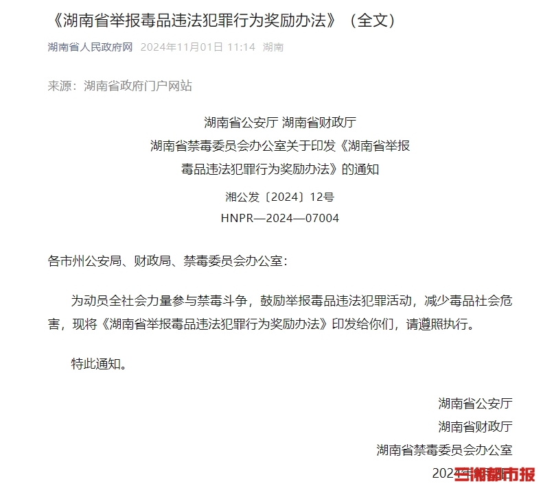 三湘都市报·新湖南客户端11月12日讯(全媒体记者 王智芳)11月12日,记者从湖南省公安厅获悉,为发动群众积极检举、揭发毒品违法犯罪活动,省公安厅联合省财政厅、省禁毒委员会办公室印发《湖南省举报毒品违法犯罪行为奖励办法》(简称《办法》)的通知,对打击毒品犯罪、治理严重毒品问题有特殊贡献的举报人,一次性最高可获50万元奖励。