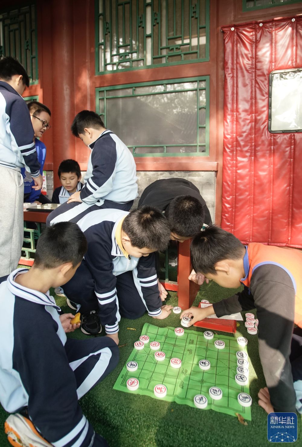 11月14日,北京市黑芝麻胡同小学的学生在课间下棋。