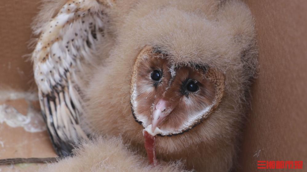 当时,不仅是朱宣斌,蓝山县林业部门还陆续接到了其他村民的类似报告。原来,在楠市、土市等乡镇的山林间,共有十只猴面鹰幼鸟亟待救援。这些幼鸟,个头大、心形脸、圆眼炯炯有神,一身奶黄色绒毛让人忍俊不禁,但一靠近就会发出“呼呼呼”的稚嫩叫声。因幼鸟无野外生存能力,县林业部门工作人员随即将它们装入纸箱中,带回野生动植物保护站救护。