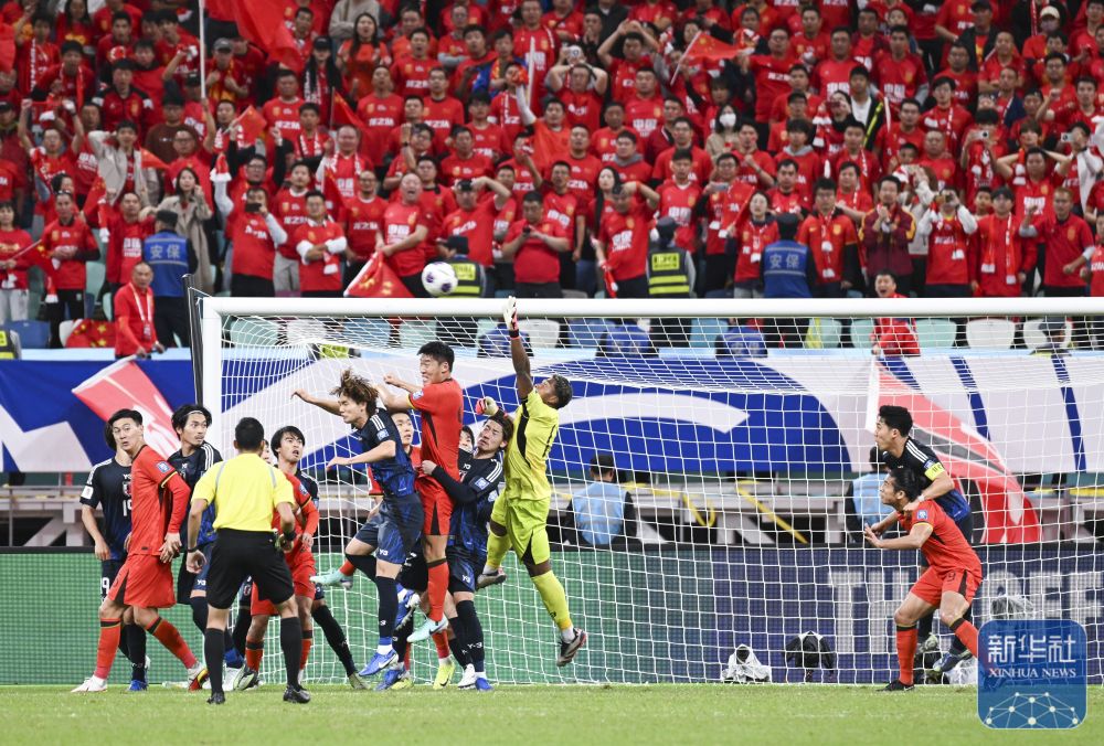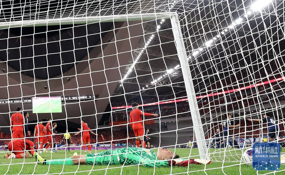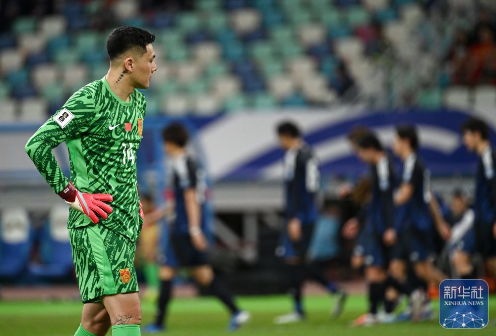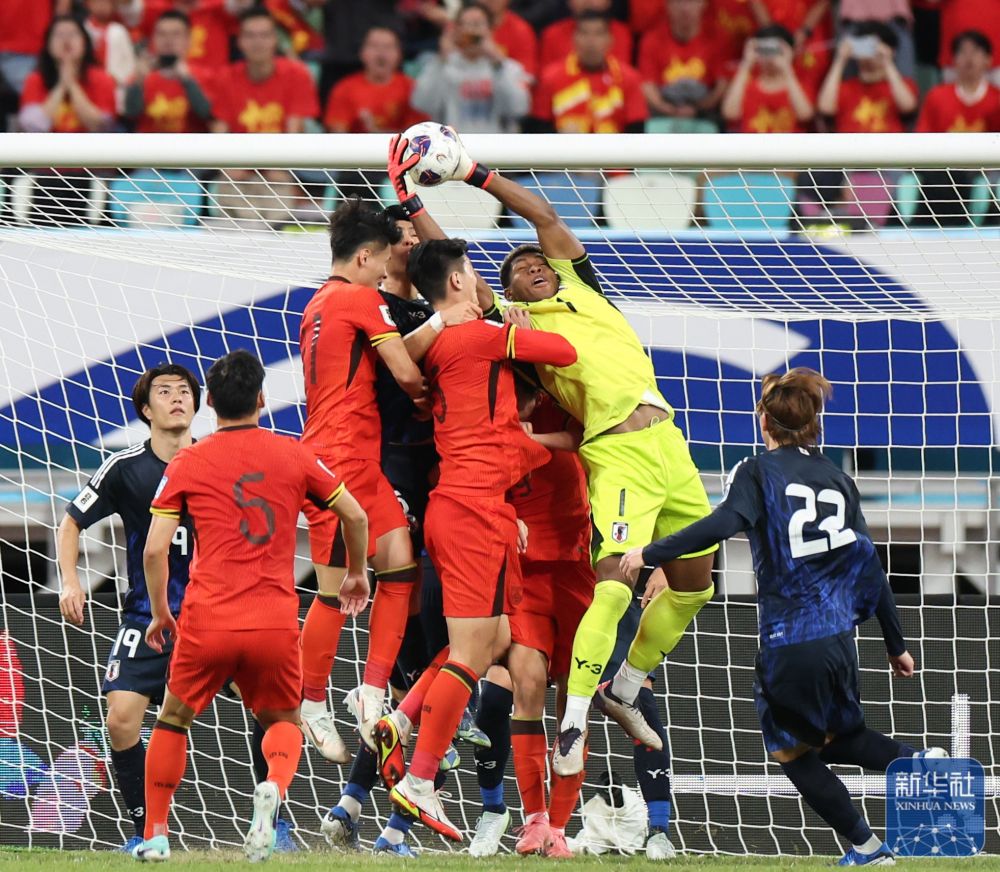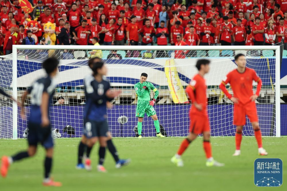 ↑中国队守门员王大雷(左)未能扑出日本队第二粒进球。新华社记者 曹灿 摄