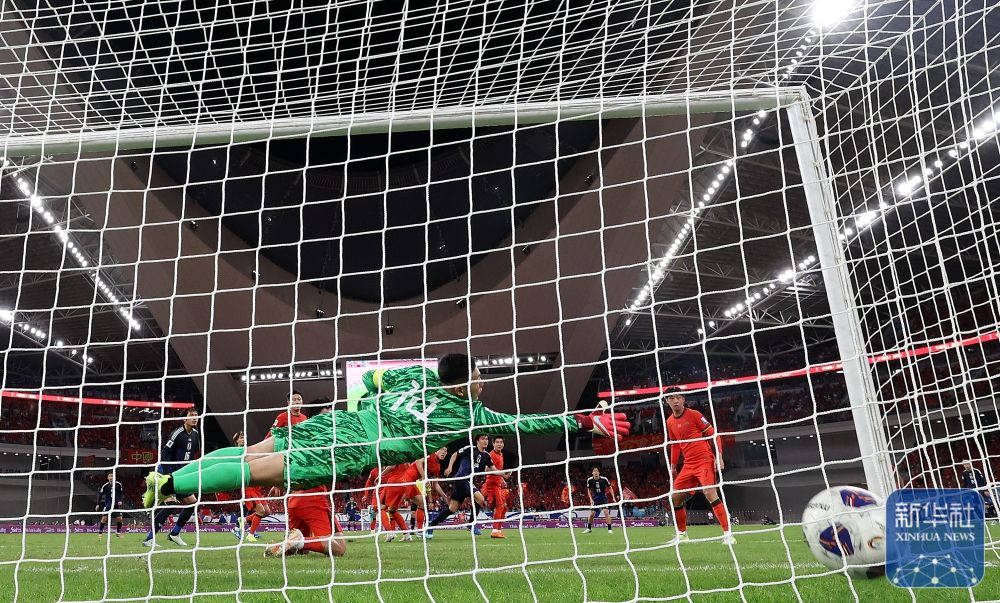 ↑中国队守门员王大雷未能扑出日本队第一粒进球。新华社记者 曹灿 摄