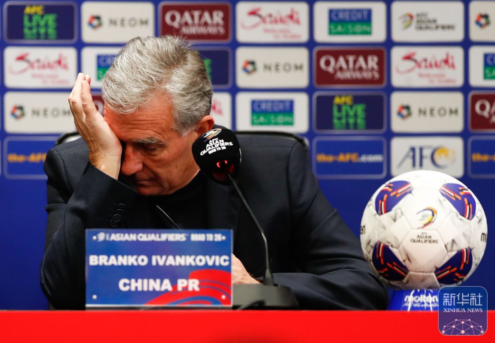 ↑中国队主教练伊万科维奇出席赛后发布会。新华社记者 胡星宇 摄
